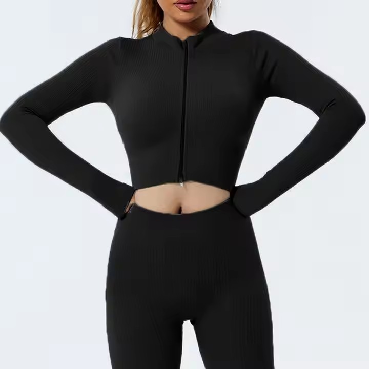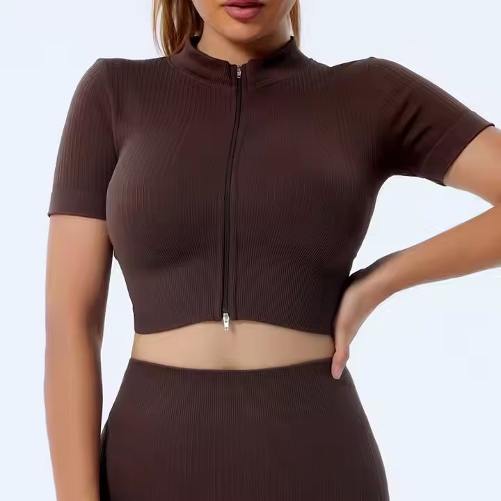 Latest Woman Fitness Clothing Wholesale Yoga Suit 6 Pieces Set Seamless Pinstripe Double Zipper Crop Top Deep U Neck Sports Bra