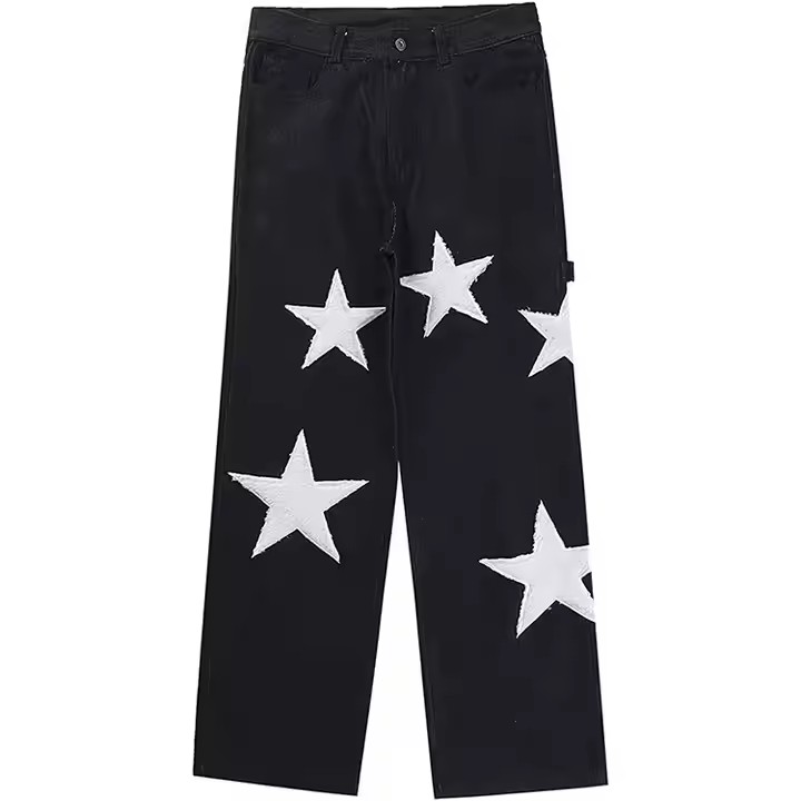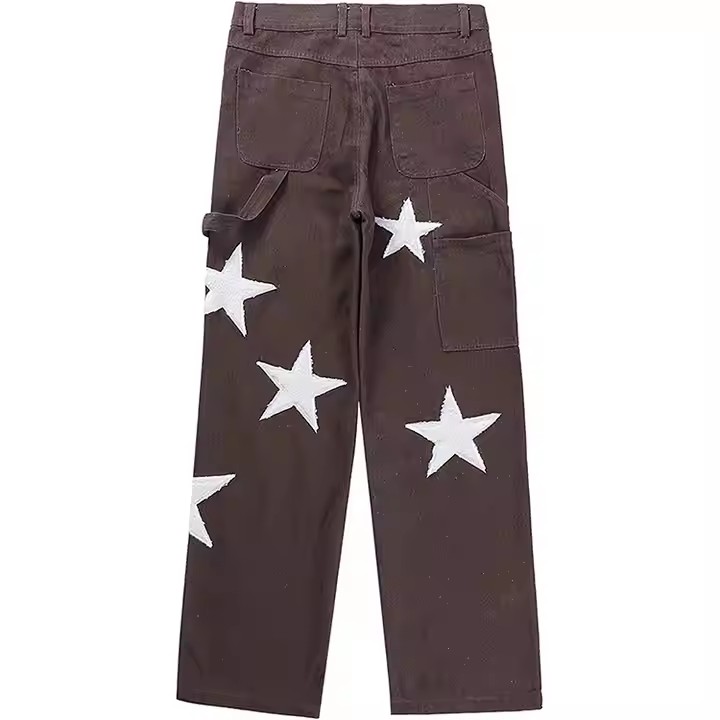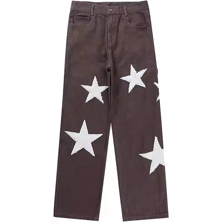 High Quality Fashion Straight Wide Leg Star Print Unisex Jeans Multi Pockets Belt Ring Casual Jeans Men
