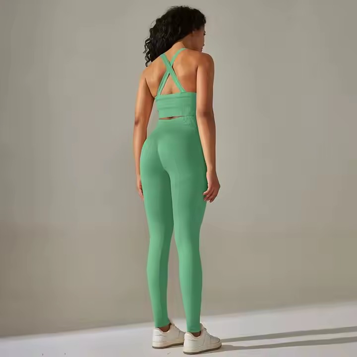 OEM Seamless Pilates Workout Running Yoga Leggings Set Gym Wear for Women 2Pcs Cross Bra Beautiful Back Fitness Clothes